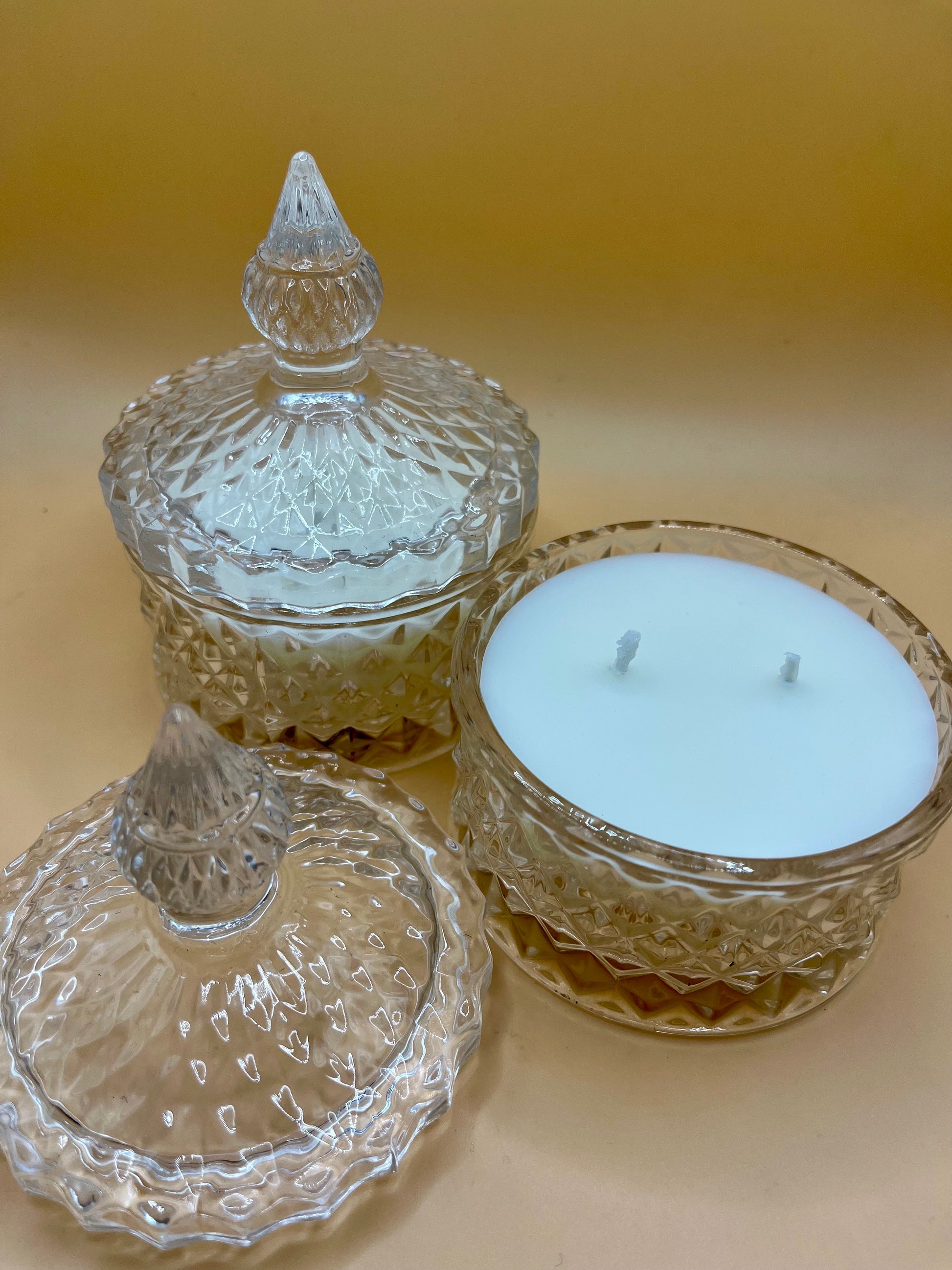 Small hand-poured soy candle in crystal jar. Only available in Jasmine scent.