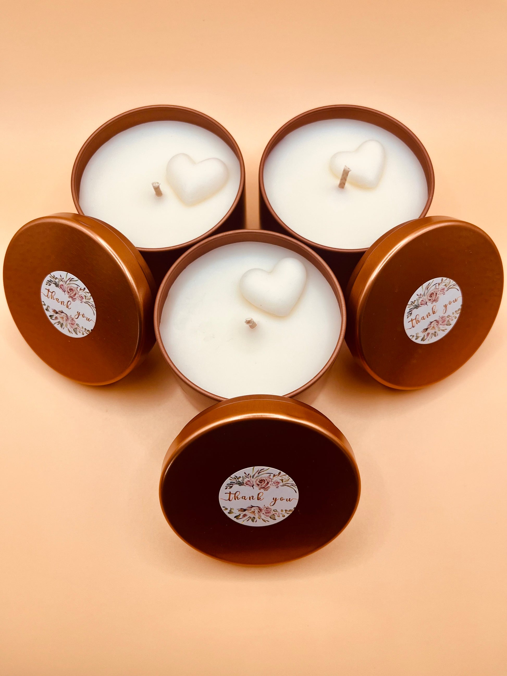 Small travel-sized soy candle in a tin. Choose your scent contact us if you would like your logo to be printed on the tins for businesses, weddings, baby shower or any occasion. Other colored tins can be also ordered upon request. Choose your scent.