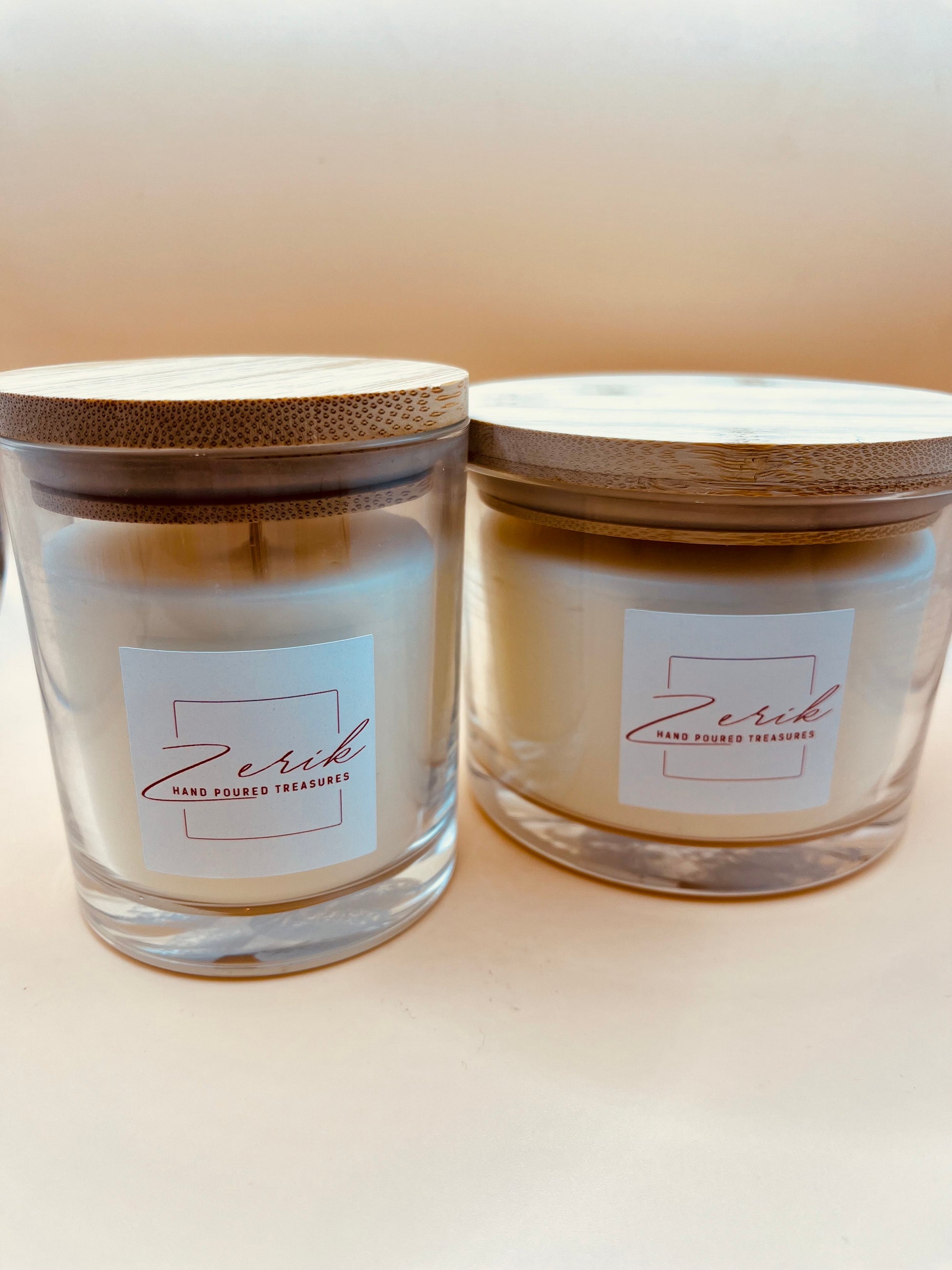 Hand-poured soy candle with a bamboo top. Burning over 150 hours. Choose your scent.